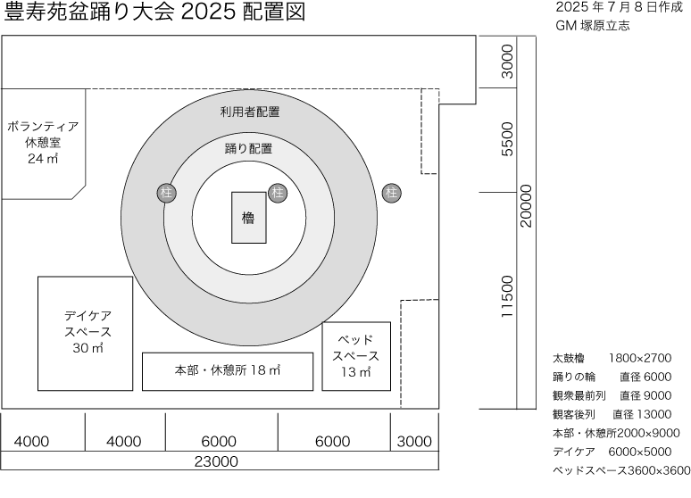 ホールの中央付近に高さ約40センチ三畳敷きの高台の上に太鼓を設置し櫓とします。そのまわりに二重に踊りの輪をつくります。